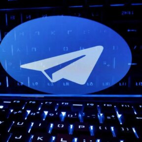 A keyboard is placed in front of a displayed Telegram logo in this illustration