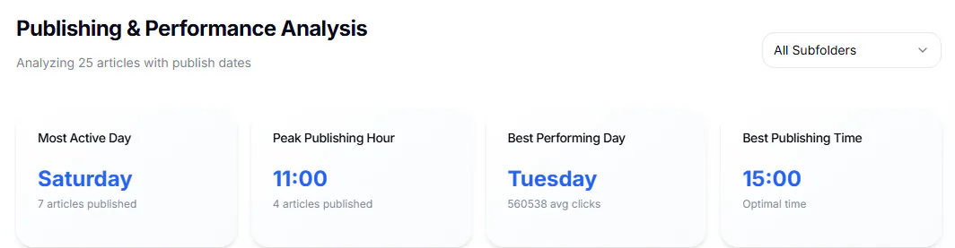 Massive newsrooms run evaluation on publishing volumes, instances, and content material freshness pretty persistently and at a desk-level. In case you solely have 50 or fewer articles per 30 days making it into Uncover, you in all probability don’t want to do that.